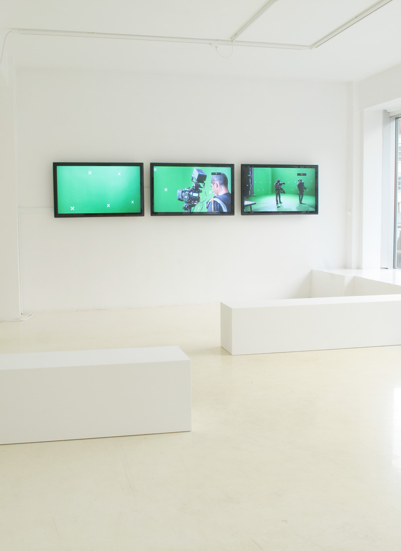 Danilo Correale further elaborates on the collapse of reality into hyperrealism as identified by Baudrillard in Symbolic Exchange and Death. The work shown at Entrée, We Are Making History, consists of a three-channel video that features a Chroma Key-equipped film studio, where the production rhetoric and the backstage itself are revealed. The viewers will face 'the image for what it is’, in what is now perceived as the standard definition of digital cinema.