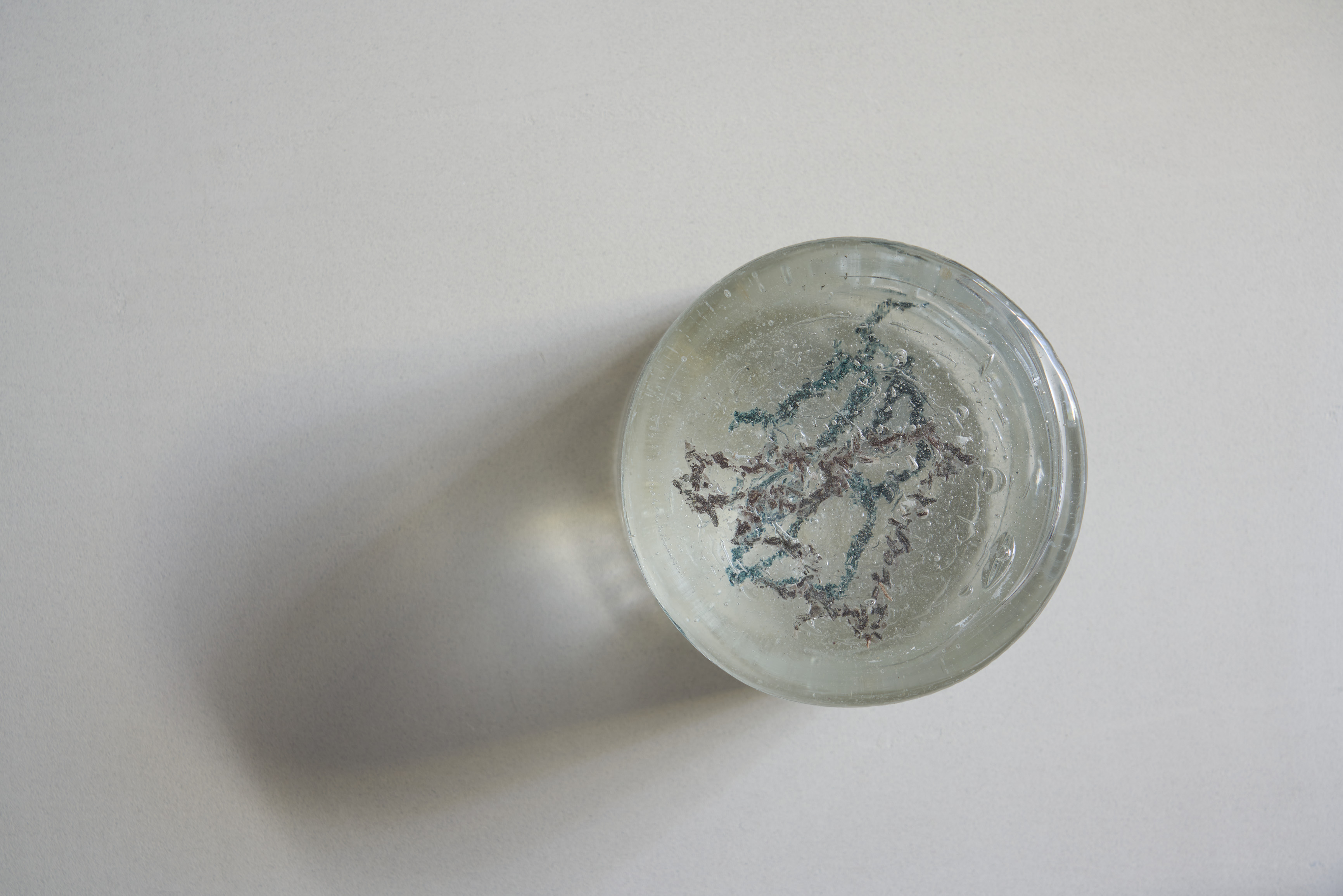 Contemplating, is thus a main theme of the project, arising from the artists own drifting in and around Bergen this fall. She has traced and documented her routes, and meticulously transferred these records onto glass sheets using found organic materials collected on her paths. Moss, sand, weeds and flowers have left multiple kinds of residues representing and drawing direct lines to its original location. Layered into casted solid cylinders, these “archived maps” now seem to float, whilst at the same time appear as excavated archaeological samples.