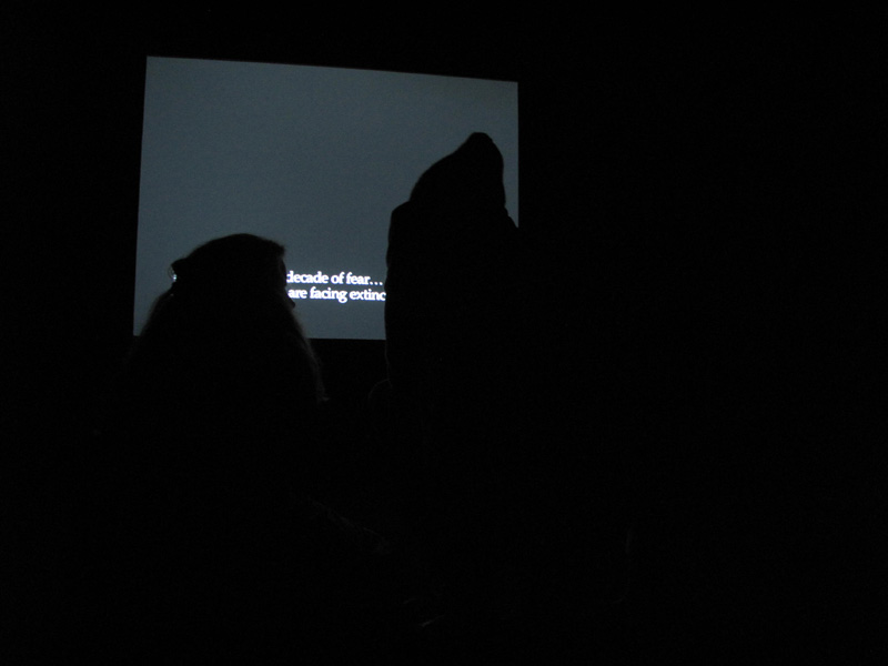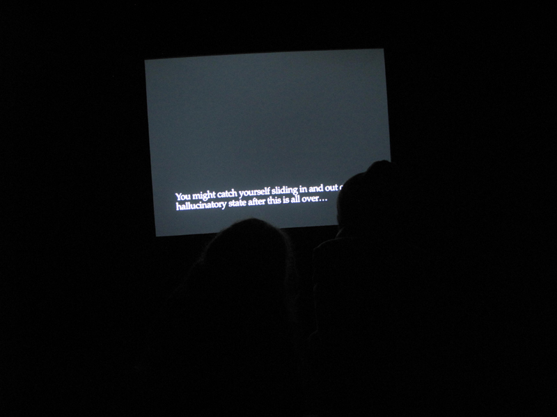 Randi: Utstillingen din på Entrée er over. Den viste seg å være vanskeligere å dokumentere enn mange andre utstillinger vi har hatt. Billedmaterialet viser en stor, sort boks som tok opp hele rommet. Gjennom en lyssluse kom man inn i et beksvart rom, hvor en video var projisert på den ene veggen. Skjermen er svart, med unntak av en undertekst som følger monologene fra lydsporet. Vil du fortelle litt mer om arbeidet?