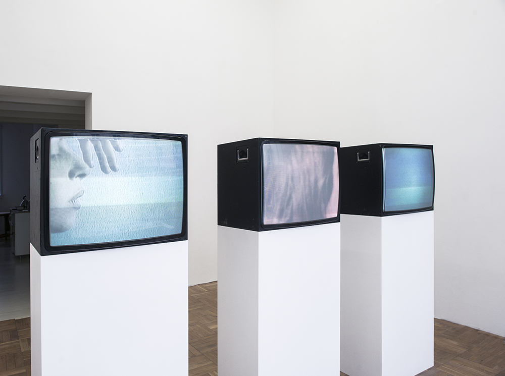 Employing several iterations of each frame, posing and filming herself in front of the monitor, with the works Collage and Now Benglis amasses swirling abysses of artificial color and hypnotizing rhythm while Female Sensibility doubles the female figure in an elongated kiss between two women (Benglis and Marilyn Lenkowsky). Connecting her hands-on, process-oriented sculptural work to self-reflexive interrogations of a newborn medium, Benglis confronts her own image with a salty and humorous aftertaste, coyly asking: “Do you wish to direct me?”