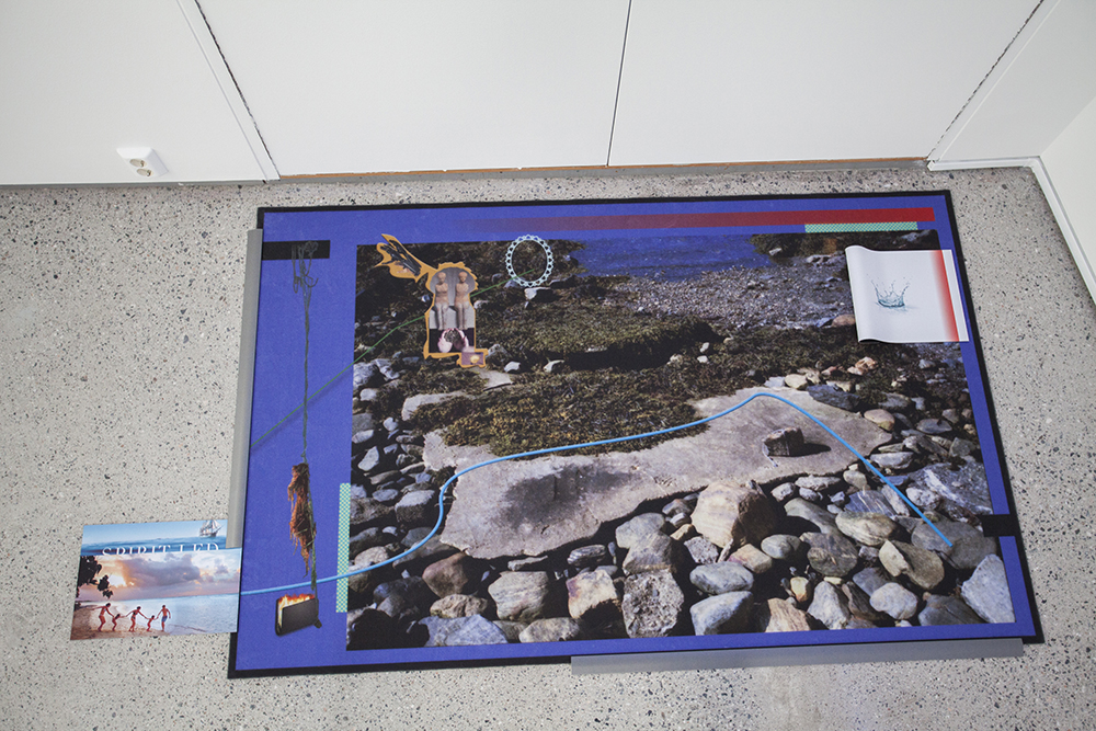 Materials: Blackberry 10 Q5 720px photo (pond, Ulriken); Blackberry 10 Q5 720px photo (communication tower, Ulriken); Blackberry 10 Q5 720px photo (hanging, Oslo); Blackberry 10 Q5 720px photo (lock, Kongssvinger); iphone SE photo 3024x4032px (Naturens kraft, catalogue KODE); found emoticon shell; found emoticon water drop; found photography snake; found photography “Claudia Mitchell first women with bionic arm” [2006] Getty images; found photography “cave at Sjong ca 1900”, unknown photographer, national archives, collection of the port agency; vector-graphics; vector-graphics lifted from dust-cover of Mary Wollstonecraft “Letters…” [1796]. + Neoprene-rug 36x25 cm “splash inverted” (2018) and metal transition strips (grey aluminium).