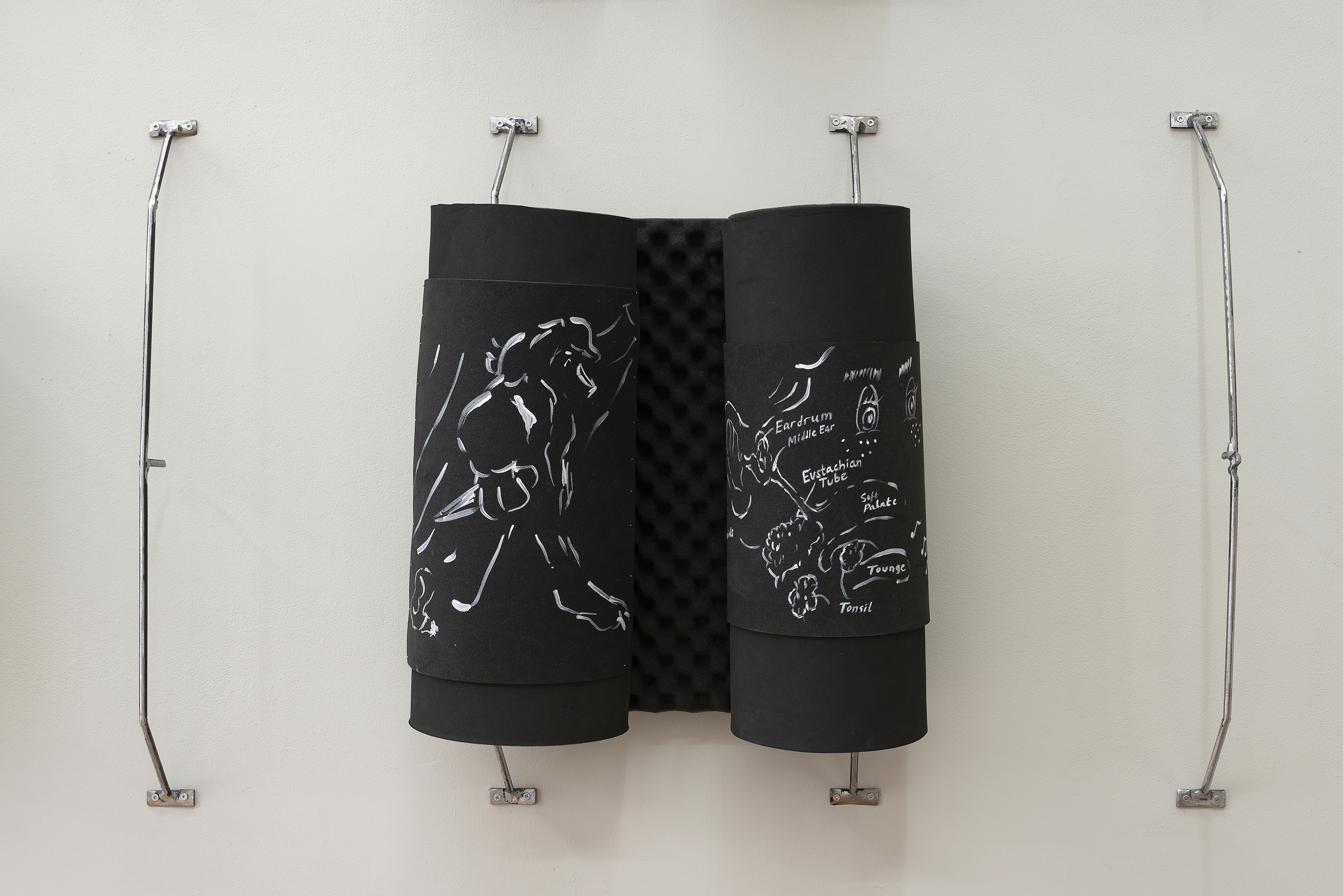 Sara Wolfert, Lion Channels (2020), drawing on acoustic isolation foam, steel