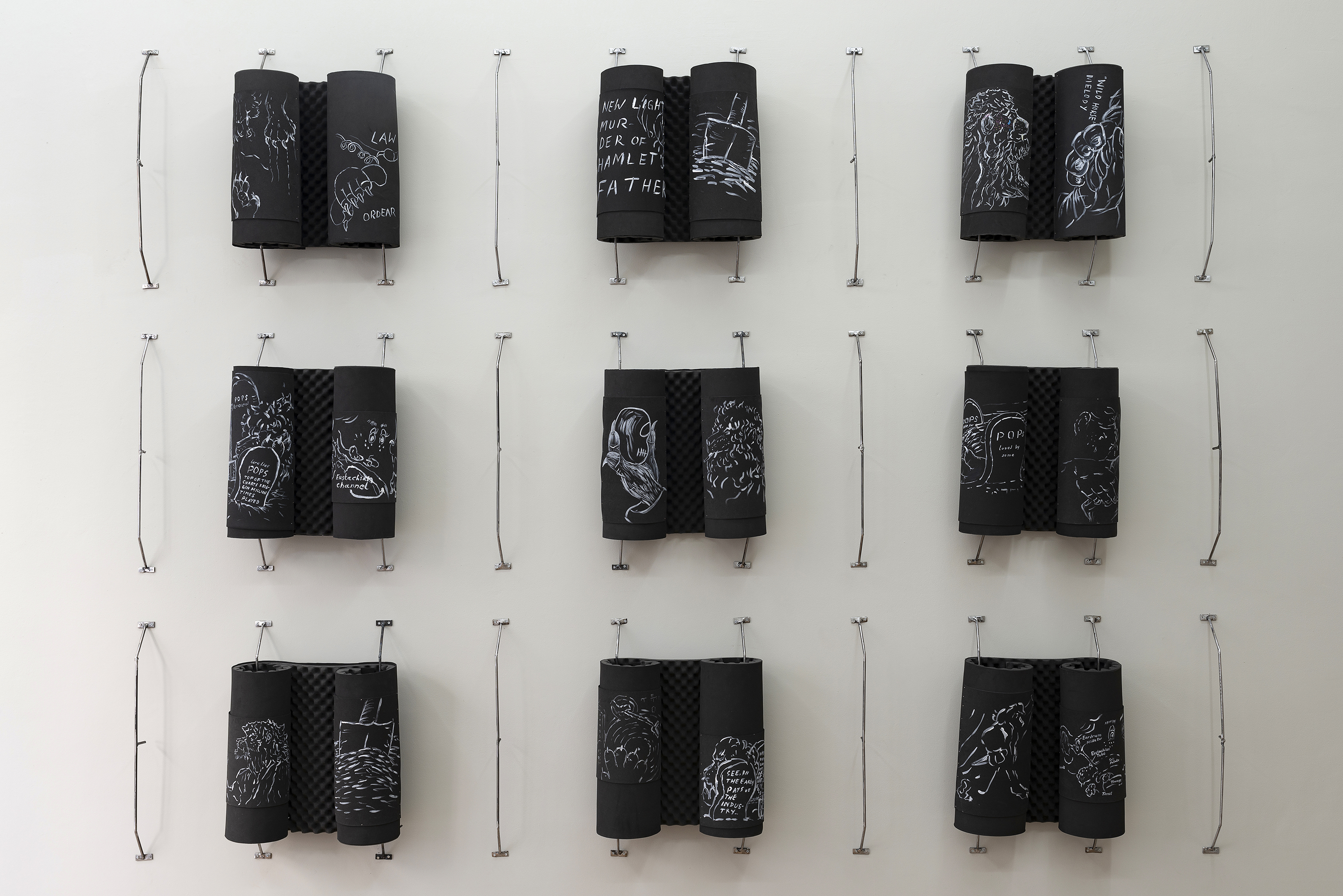 Sara Wolfert, Lion Channels (2020), drawing on acoustic isolation foam, steel (detail)